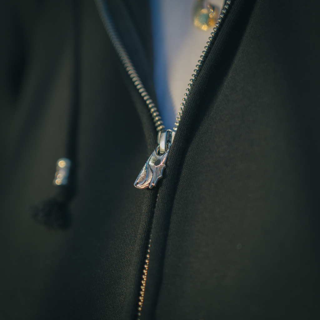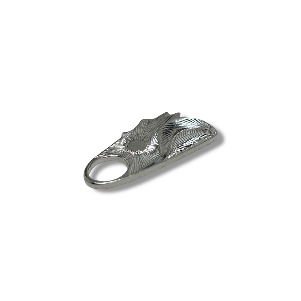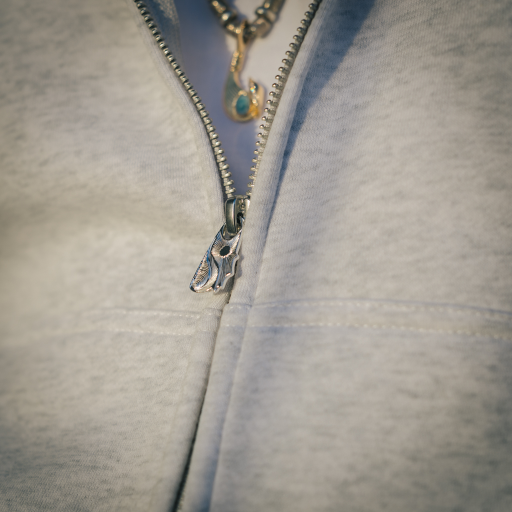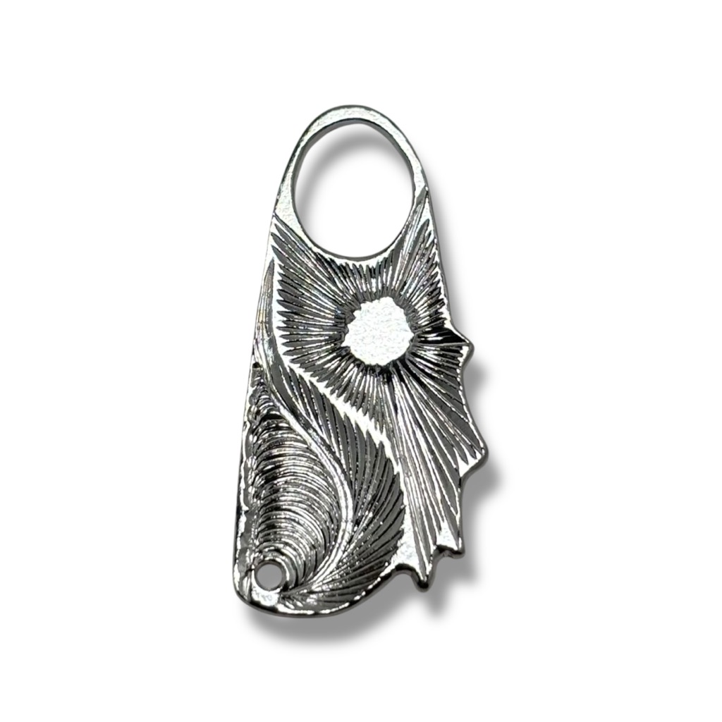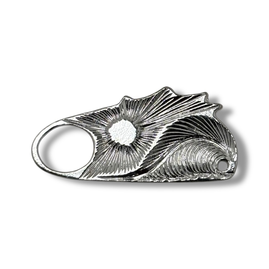 ブランドのアイコンである「波」と「太陽」が彫刻された、Kaioceanフーディに使用しているオリジナルジッパープルです。
