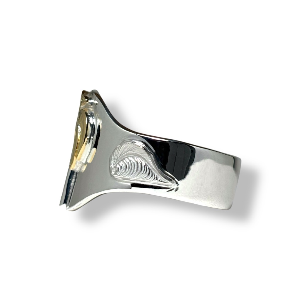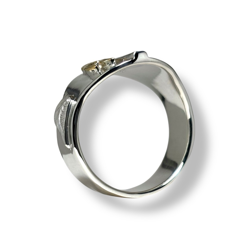 シルバーベースの本体の葉の部分を一段低くし、K18ゴールドを用いた同一形状のパーツを面一に合わせることで葉の部分に華やかさを加えました。