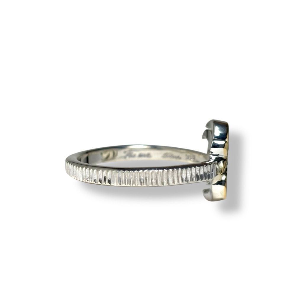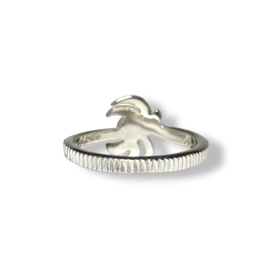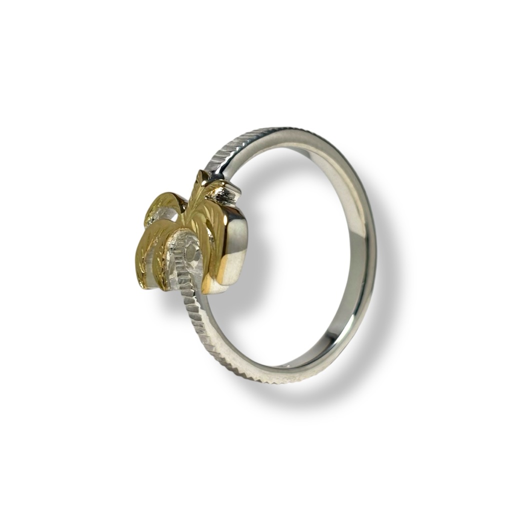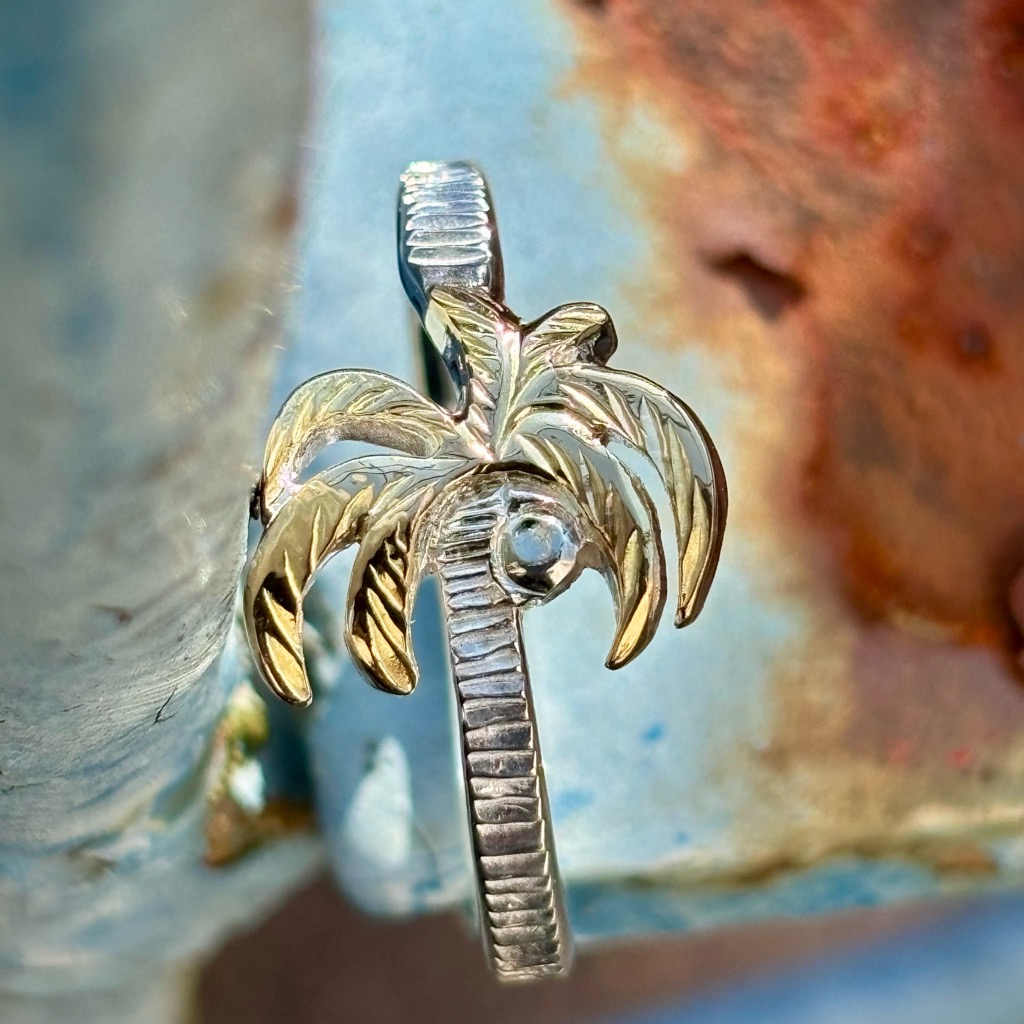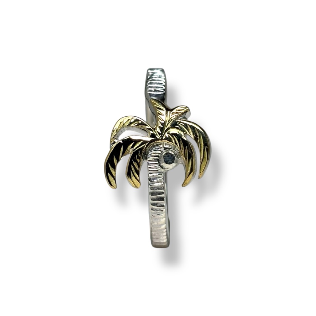 通常の着用では正面から見るとヤシは横向きに見えますが、ピンキーリングなどでゴールド部分を横にして着用すると、横から見た際にヤシが縦に現れる、そんな小粋な遊び心も込めています。