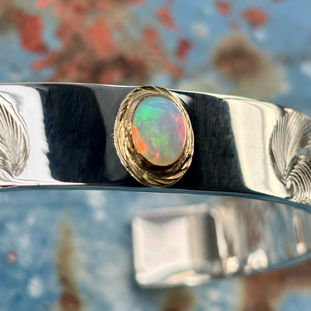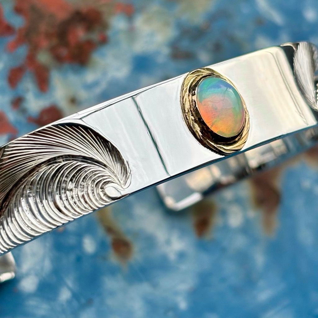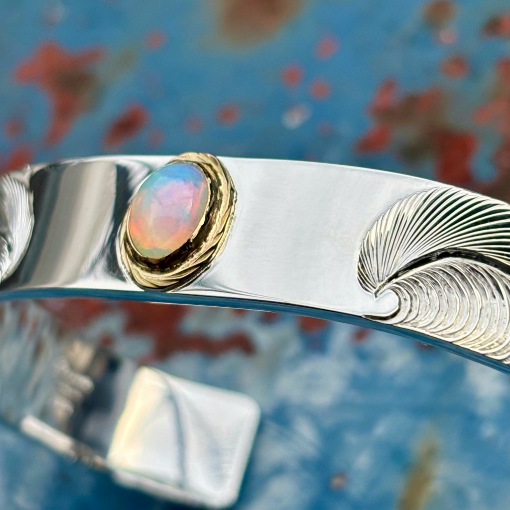 【特注品】6×8mmオパール/K18覆輪・ナル&ライジングラー12mmバングル¥ 151,800 (税込) 通常アイテムのラリマーをオパールにした、イベント時限定販売のカスタム仕様です。 【マテリアル】 ・K18イエローゴールド ・シルバー925 ・オパール 【サイズ】(最大値慨寸mm※) 150×12×2 ※バングル内周約150mm ※各種加工により完成時実寸は異なる場合がございます。 質問・見積り 在庫切れ 商品コード: e229opal カテゴリー: 特注アイテム 追加情報 追加情報 モチーフ・デザイン カイ/Kai(海)・ナル/Nalu(波), ラー(太陽)/Lā 関連商品 【春季限定アイテム】K18 ダイヤモンドSakuraモチーフ・ナル&ライジングラーバングル(8mm) ¥ 125,400 (税込) 【特注品】Makanalu「キャッチ・ザ・ウェーブ」ペンダントL(オパール/K18覆輪) ¥ 116,600 (税込) 【春季限定アイテム】K18 ダイヤモンドSakuraモチーフ・ナル&ライジングラーリング(8mm) ¥ 121,000 (税込) 【特注品】Makanalu「キャッチ・ザ・ウェーブ」ペンダントM(ラリマー/K18無垢/ダイヤモンド一連) ¥ 627,000 (税込)